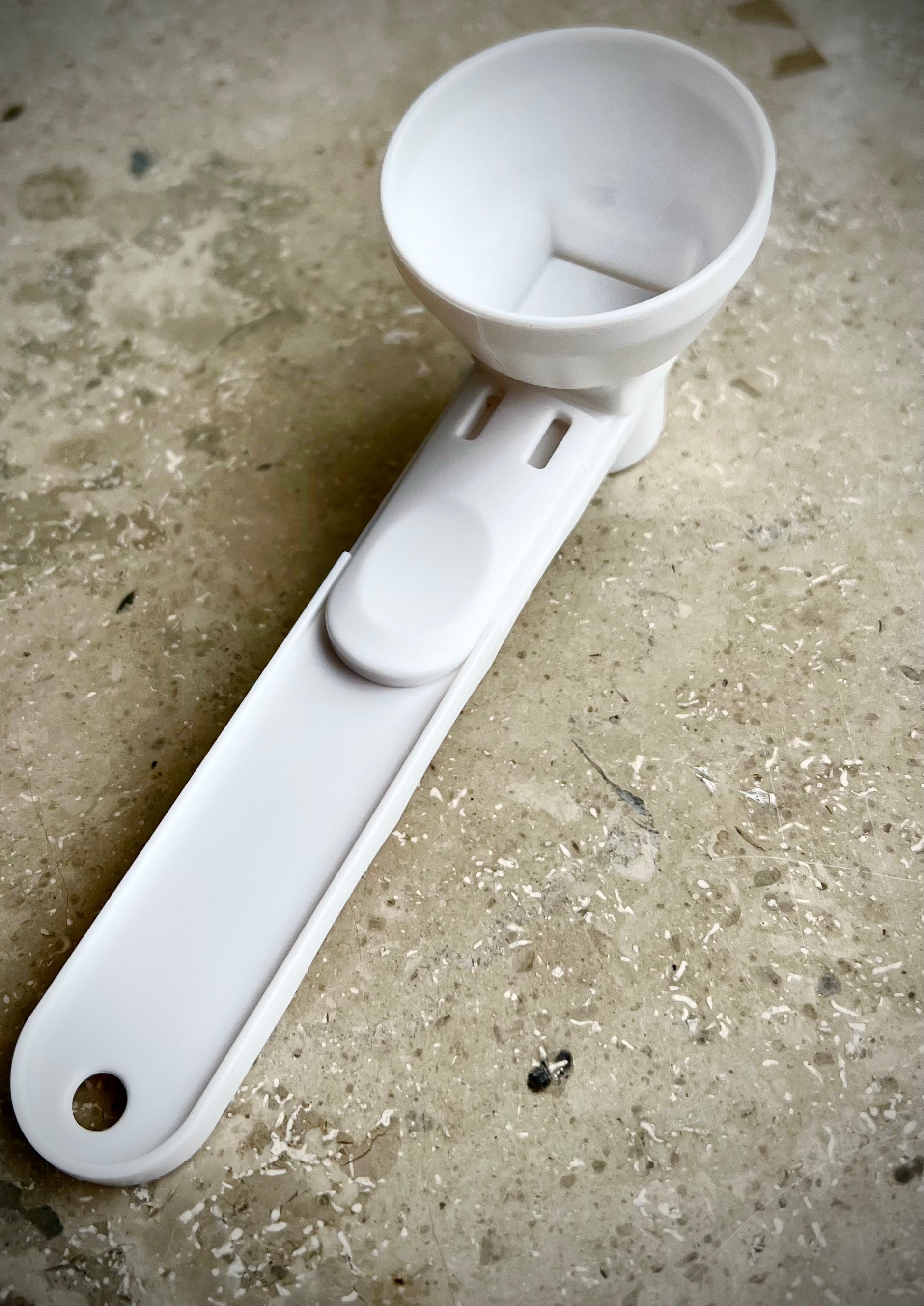 Der Scoop mit Schiebefunktion ermöglicht kontrolliertes Dosieren ohne Kleckern – ideal für Pulver, Flüssigkeiten oder Supplemente. Hergestellt für maximale Hygiene und Benutzerfreundlichkeit.